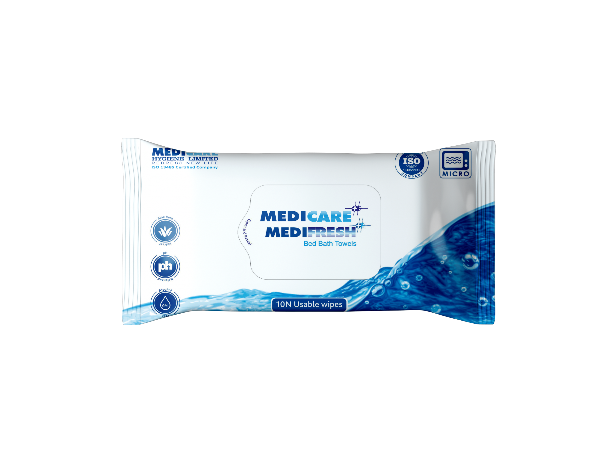 Bed Bath Towels are soft, and highly absorbent towels designed for personal care and patient hygiene in hospitals, clinics, and care facilities. Made using spunlace technology and pure water, these towels are natural, alcohol-free, and pH-balanced to reduce the potential for skin irritation. Enriched with Aloe Vera extract and Vitamin E, they provide gentle care, nourishment, and comfort for the skin while effectively absorbing moisture, ensuring cleanliness and freshness. Lightweight yet durable, these towels are easy to handle, quick to dry, and maintain their softness and skin-friendly properties even after repeated use, making them ideal for daily patient care and hygiene routines.